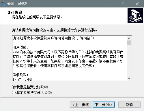 首先安装 eNSP,前面的只有一个按钮选项,点击就行