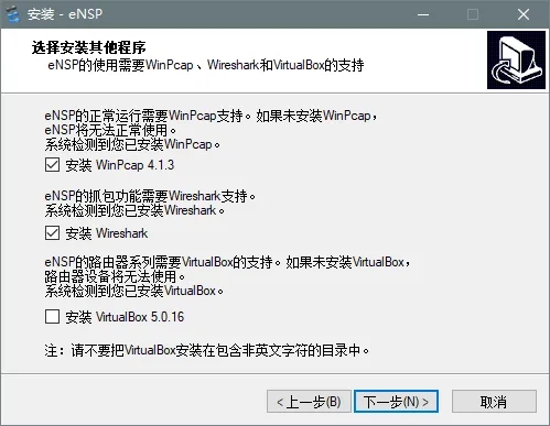 接着按提示安装完 eNSP、WinPcap、Wirehark 即可