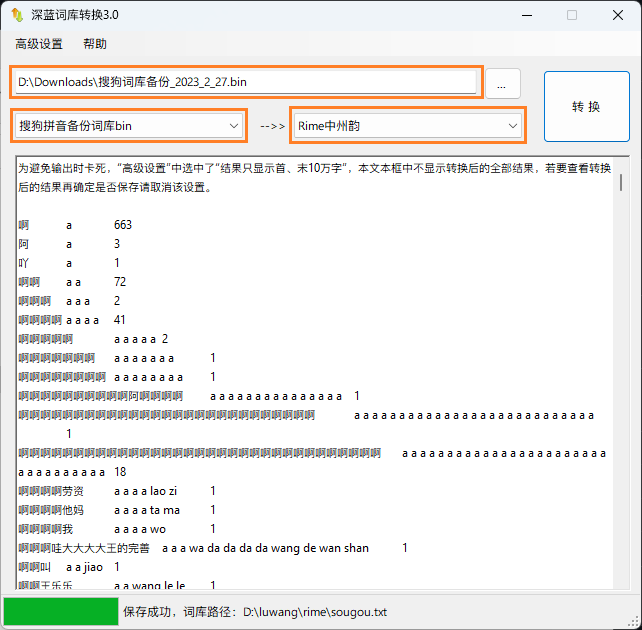 我们在搜狗输入法里把自己的词库导出,应该是 .bin 文件,我们需要借助 imewlconverter-v3.0.0 深蓝词库转换这个工具把它转成 Rime 支持的词库(这个版本是支持 Win 和 mac 的)