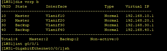 [LWS2-Vlanif40]vrrp vrid 40 vi 192.168.40.1