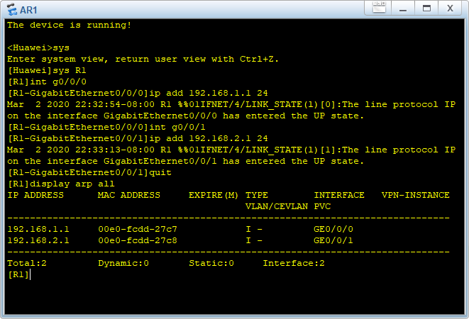自己再到 PC 和 R1 上分别执行 arp -a 和 display arp all 查看结果吧,我就不贴图了