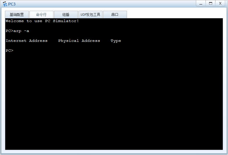 进入任一台 PC 机命令行,输入命令 arp -a 查看主机的 ARP 表