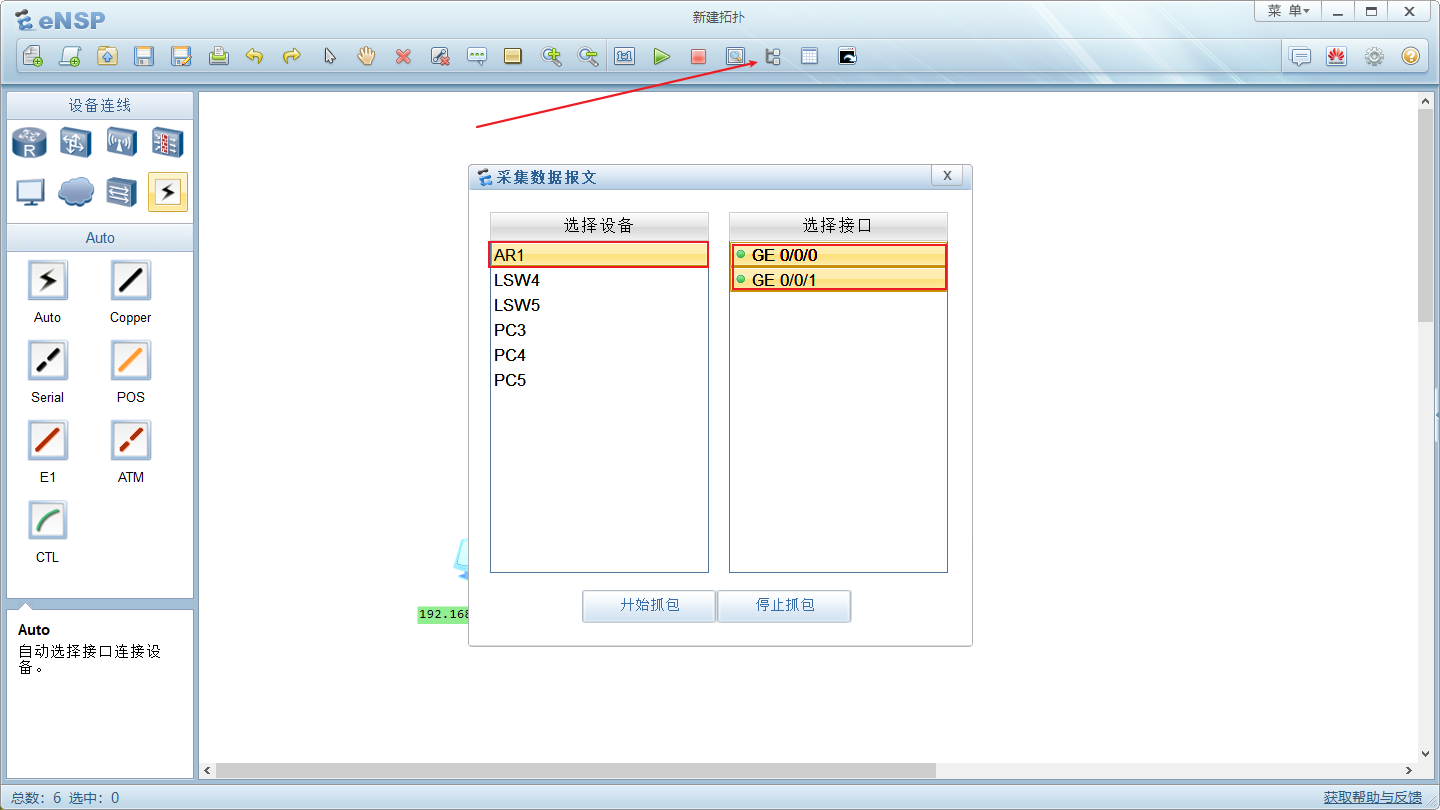 点击图示位置,选择好设备和接口,开始抓包,这时将会打开 wireshark