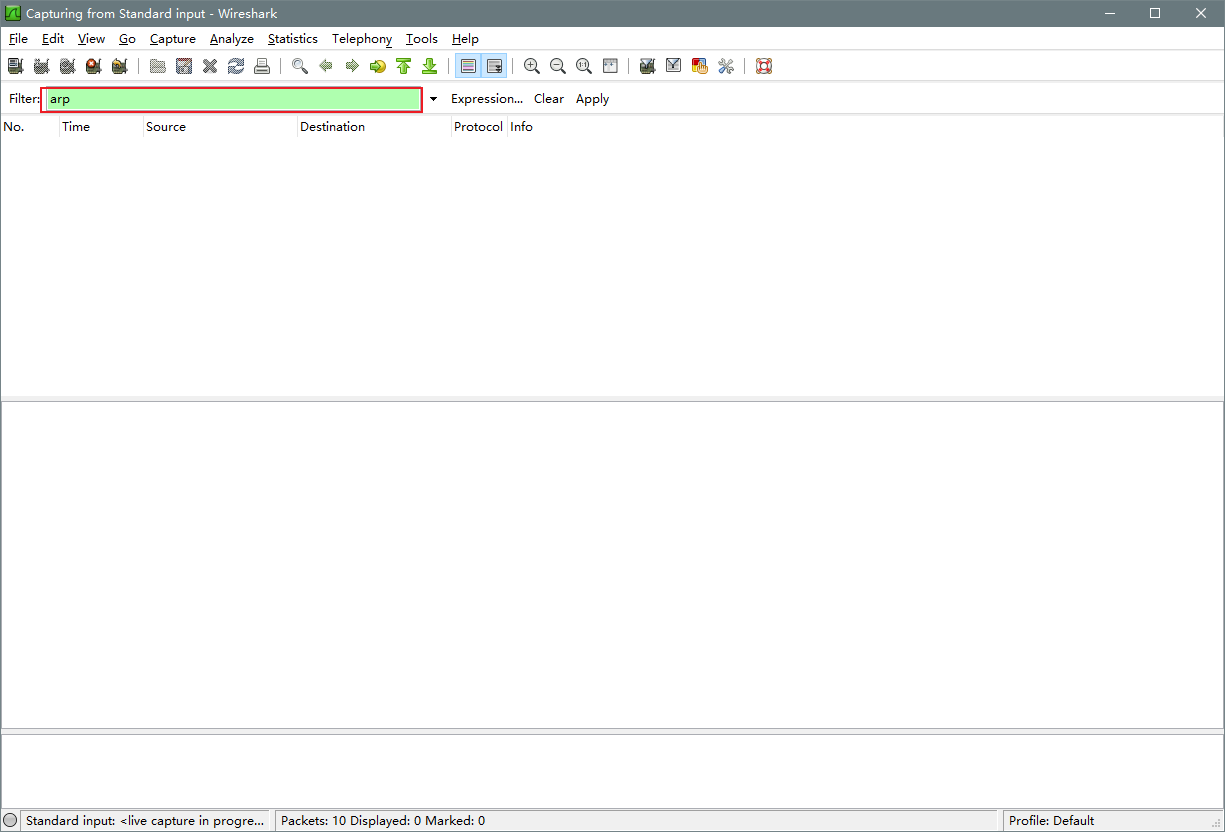 打开 wireshark 后会开始抓取数据包,我们只想看到arp的数据包,因此,在红框中输入arp后回车,开始过滤数据包