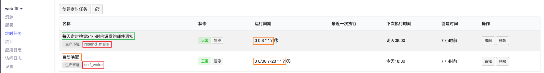 名称:自动唤醒 生产环境:self-wake Cron表达式:0 0/30 7-23 * * ? 名称:定时检查24小时内漏发的邮件通知 生产环境:resend-mails Cron表达式:0 0 8 * * ?