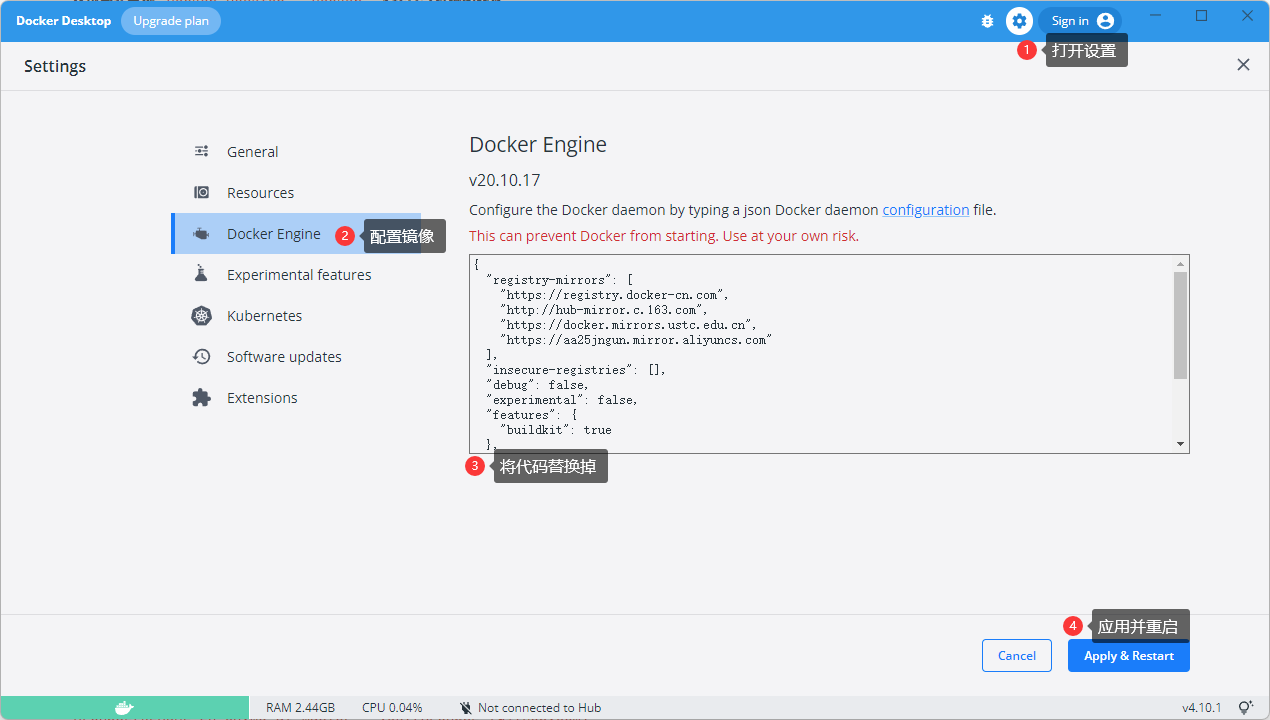 之后安装完成之后,运行软件,设置里找到 Docker Engine,把一下代码复制替换掉方框中的代码