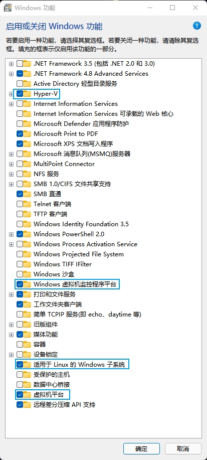和其他有关虚拟平台的勾上(没有 Hyper-V 的把其他的勾选就行),点击确定